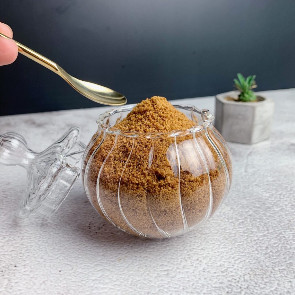 椰花蜜糖吃起來完全沒有椰子味,香氣跟味道有點類似黑糖,帶有一點點的焦香味,甜度比砂糖低。