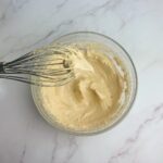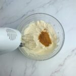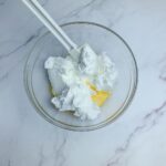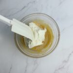 將退冰的馬斯卡邦起司用打蛋器打軟,加入冷卻的蛋黃糊攪拌均勻