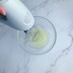 蛋黃加入10g麥芽糖醇,用打蛋器攪拌均勻,打至稍微泛白