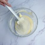 將杏仁粉+玉米粉分兩次加入麵糊中,用用橡皮刮刀混合均勻