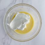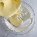 將1/2的蛋白霜倒入蛋黃糊中,用橡皮刮刀輕柔地翻拌均勻
